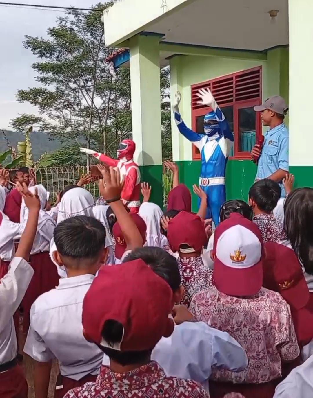Anak-anak bersorak gembira menyambut kedatangan para “pahlawan super” yang datang bukan untuk beraksi melawan kejahatan, melainkan membawa kebaikan dalam bentuk Makanan Bergizi Gratis (MBG).