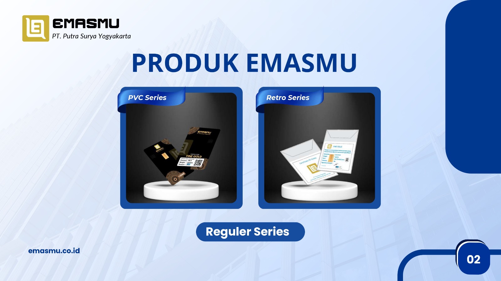 EMASMU tersedia dalam beragam varian produk, mulai dari Reguler Series, PVC Series, Retro Series, hingga Gift Series. Seluruh produk berbentuk emas fisik yang dapat langsung dimiliki dan disimpan, serta dirancang tidak hanya untuk kebutuhan investasi, tetapi juga untuk momen spesial seperti ulang tahun, kelahiran, hingga hari besar keagamaan.