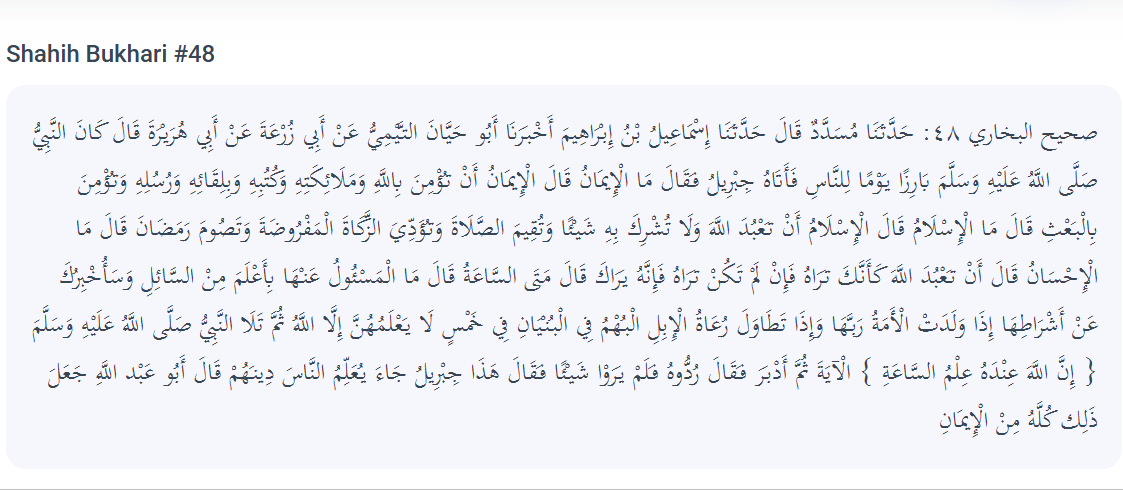 Telah menceritakan kepada kami [Musaddad] berkata: Telah menceritakan kepada kami [Isma’il bin Ibrahim] telah mengabarkan kepada kami [Abu Hayyan At Taimi] dari [Abu Zur’ah] dari [Abu Hurairah] berkata: bahwa Nabi shallallahu ‘alaihi wa sallam pada suatu hari muncul kepada para sahabat, lalu datang Malaikat Jibril ‘Alaihis Salam yang kemudian bertanya: “Apakah iman itu?” Beliau menjawab: “Iman adalah kamu beriman kepada Allah, malaikat-malaikat-Nya, kitab-kitab-Nya, pertemuan dengan-Nya, Rasul-Rasul-Nya, dan kamu beriman kepada hari berbangkit.” (Jibril ‘Alaihis salam) berkata: “Apakah Islam itu?” Beliau menjawab: “Islam adalah kamu menyembah Allah dan tidak menyekutukannya dengan suatu apapun, kamu dirikan shalat, kamu tunaikan zakat yang diwajibkan, dan berpuasa di bulan Ramadan”. (Jibril ‘Alaihis salam) berkata: “Apakah ihsan itu?” Beliau menjawab: “Kamu menyembah Allah seolah-olah melihat-Nya dan bila kamu tidak melihat-Nya sesungguhnya Dia melihatmu.” (Jibril ‘Alaihis salam) berkata lagi: “Kapan terjadinya hari kiamat?” Beliau menjawab: “Yang ditanya tentang itu tidak lebih tahu dari yang bertanya. Tapi aku akan terangkan tanda-tandanya, (yaitu): jika seorang budak telah melahirkan tuannya, jika para penggembala unta yang berkulit hitam berlomba-lomba membangun gedung-gedung selama lima masa, yang tidak diketahui lamanya kecuali oleh Allah.” Kemudian Nabi shallallahu ‘alaihi wa sallam membaca: {Sesungguhnya hanya pada Allah pengetahuan tentang hari kiamat} (Luqman: 34). Setelah itu Jibril ‘Alaihis salam pergi, kemudian beliau berkata: “Hadapkan dia ke sini.” Tetapi para sahabat tidak melihat sesuatupun, maka Nabi bersabda: “Dia adalah Malaikat Jibril datang kepada manusia untuk mengajarkan agama mereka.” Abu Abdullah berkata: “Semua hal yang diterangkan Beliau dijadikan sebagai iman.” (HR. Shahih Bukhari No. 48).