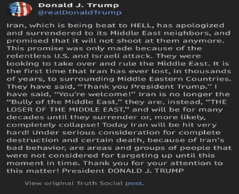 Pernyataan Donald Trump dalam unggahan di platform Truth Social, yang menyebut Iran sebagai “ The Loser of the Middle East” dan menggambarkan Iran sudah “menyerah” kepada negara-negara tetangganya, tidak menganggambarkan situasi geopolitik yang sedang terjadi. Emaridial Ulza menyebut pernyataan tersebut tidak lebih dari sekadar retorika politik dan bukan gambaran nyata dari Timur Tengah saat pertempuran berkecamuk.
