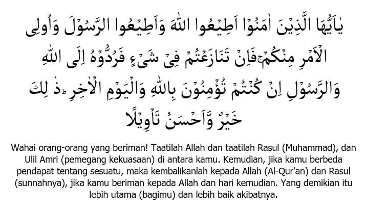 “Wahai orang-orang yang beriman, taatilah Allah dan taatilah Rasul (Nabi Muhammad) serta ululamri (pemegang kekuasaan) di antara kamu. Jika kamu berbeda pendapat tentang sesuatu, kembalikanlah kepada Allah (Al-Qur’an) dan Rasul (sunahnya) jika kamu beriman kepada Allah dan hari Akhir. Yang demikian itu lebih baik (bagimu) dan lebih bagus akibatnya (di dunia dan di akhirat).”