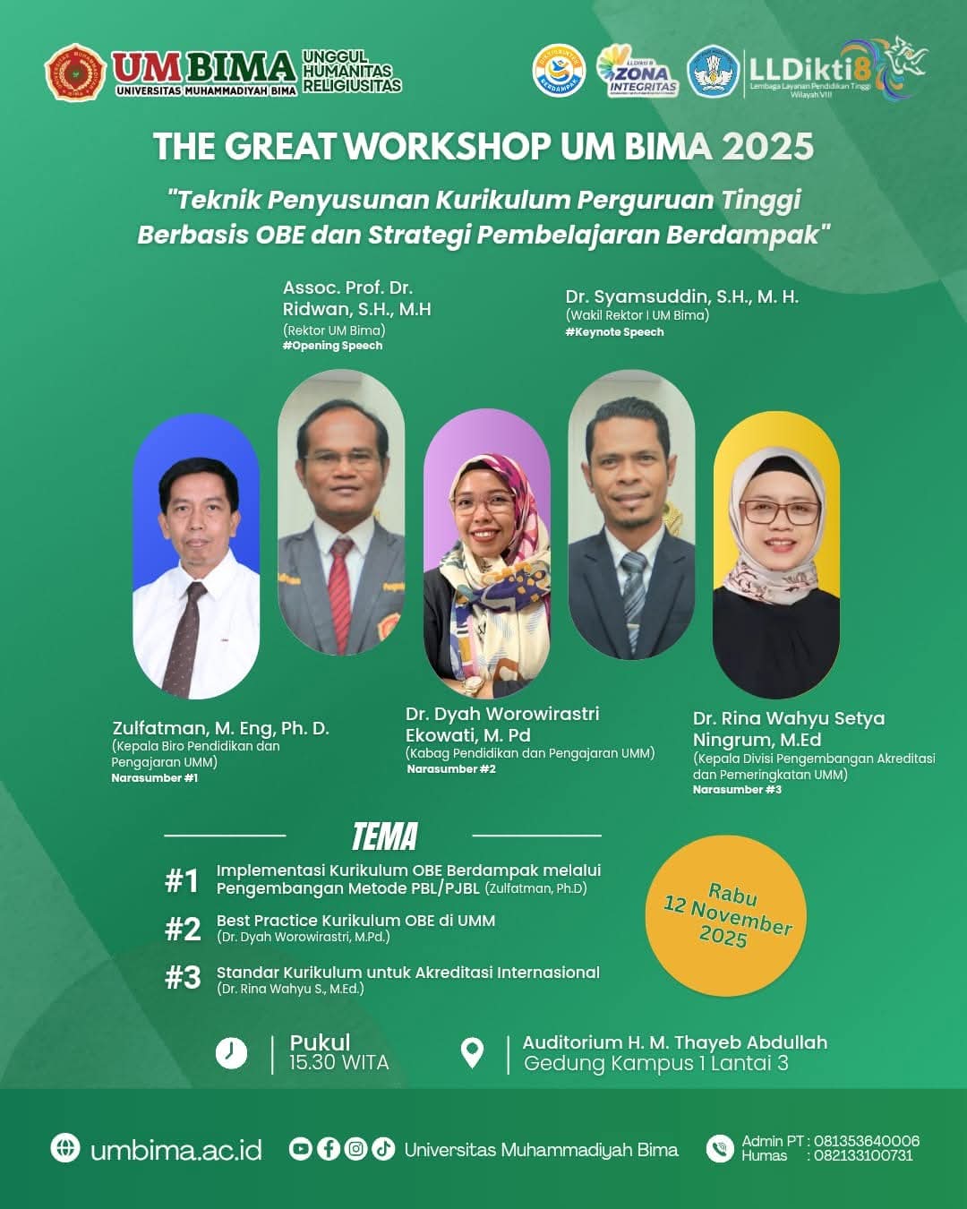 KULIAHALISLAM.COM – Universitas Muhammadiyah Bima (UMB), menggelar kegiatan The Great Workshop “Teknik Penyusunan Kurikulum Perguruan Tinggi Bermutu Berbasis Outcome Based Education (OBE) dan Strategi Pembelajaran Berdampak”. Di Aula M. Thayeb Abdullah, Kampus 1. Waktu 16:00 – Selesai. Rabu, 12 November 2025.